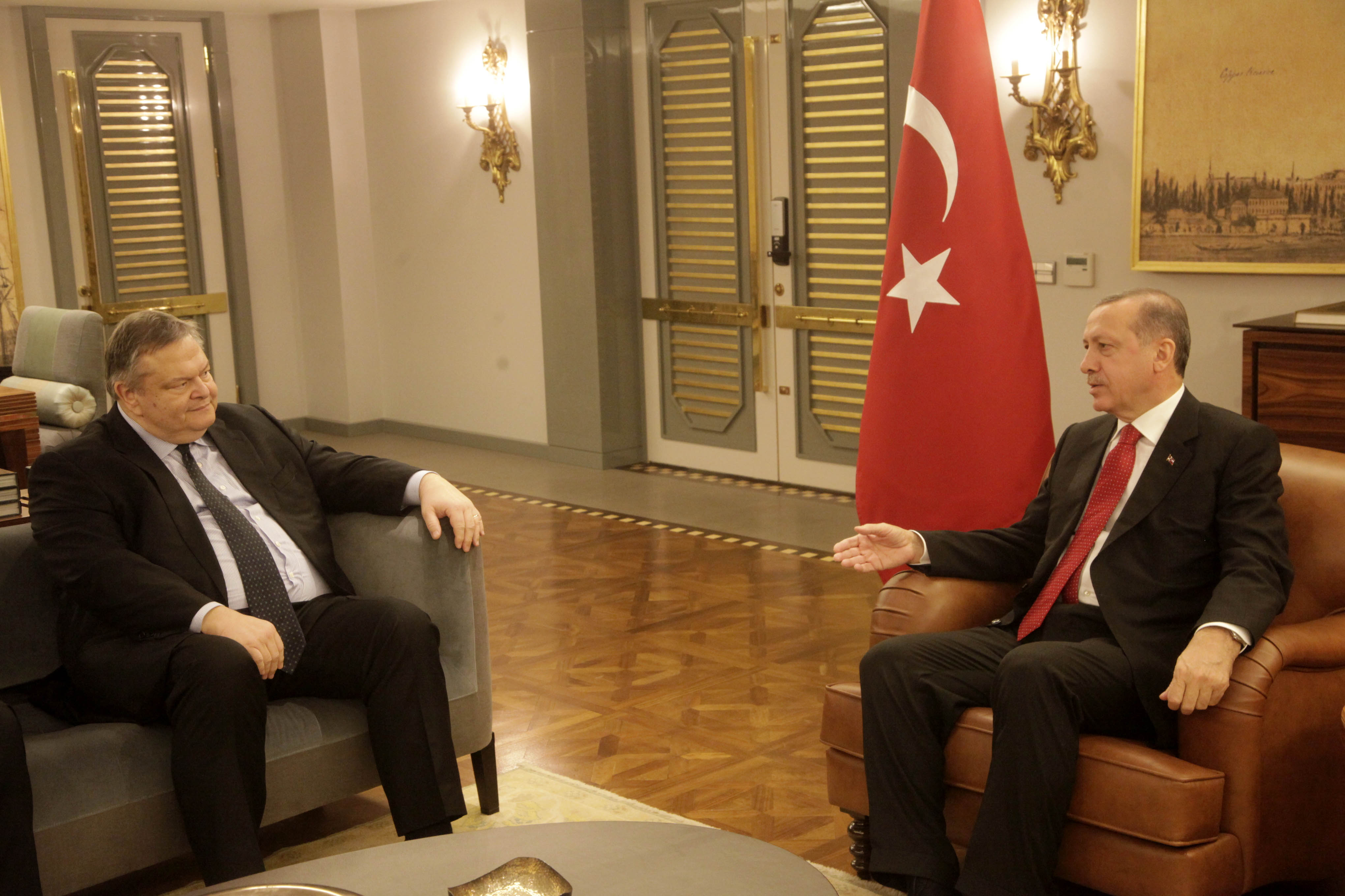 Ευ. Βενιζέλος: Η συνάντηση με τον Πρόεδρο Erdogan διεξήχθη σε ένα πολύ θετικό κλίμα, στη συνέχεια των πολύ ουσιαστικών συζητήσεων που είχαμε με τον ομόλογό μου, τον Υπουργό Εξωτερικών, τον κ. Cavusoglu, στην Άγκυρα. Βεβαίως, το κλειδί είναι το Κυπριακό και ειδικότερα η διακοπή της προσβολής των κυριαρχικών δικαιωμάτων της Κυπριακής Δημοκρατίας, η παρουσία του τουρκικού ερευνητικού σκάφους στην Αποκλειστική Οικονομική Ζώνη της Κύπρου.
