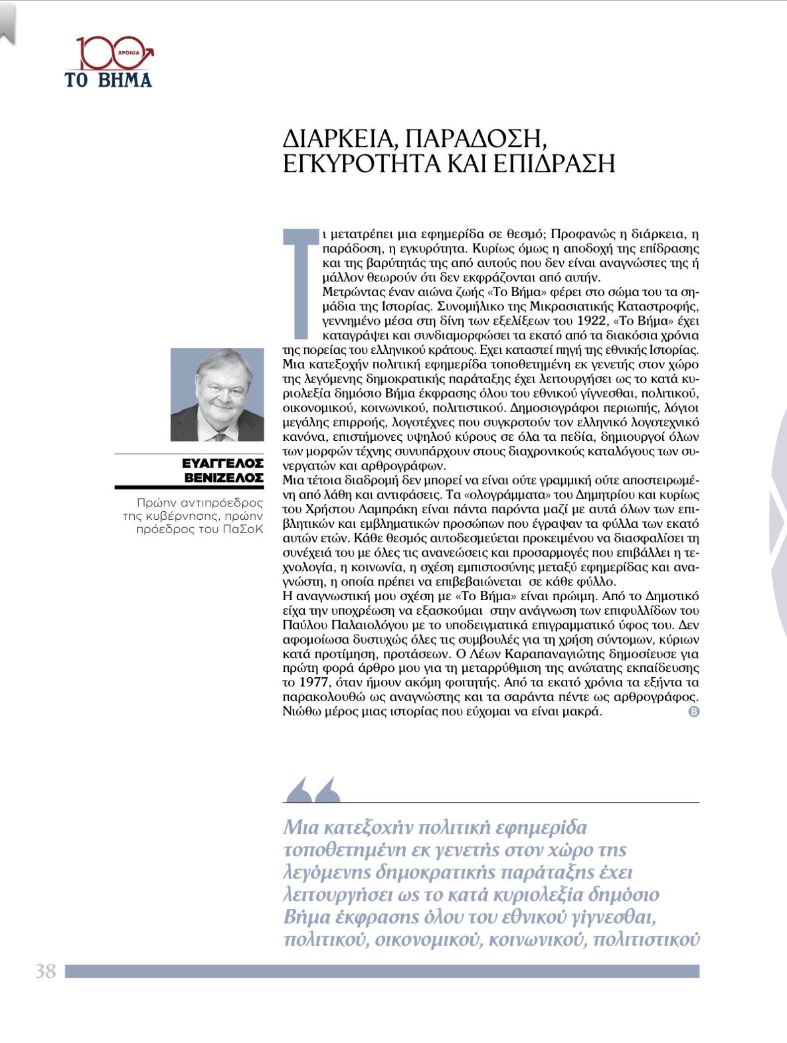 Άρθρο Ευάγγελου Βενιζέλου στο αφιέρωμα 1922-2022, 100 χρόνια ΤΟ ΒΗΜΑ