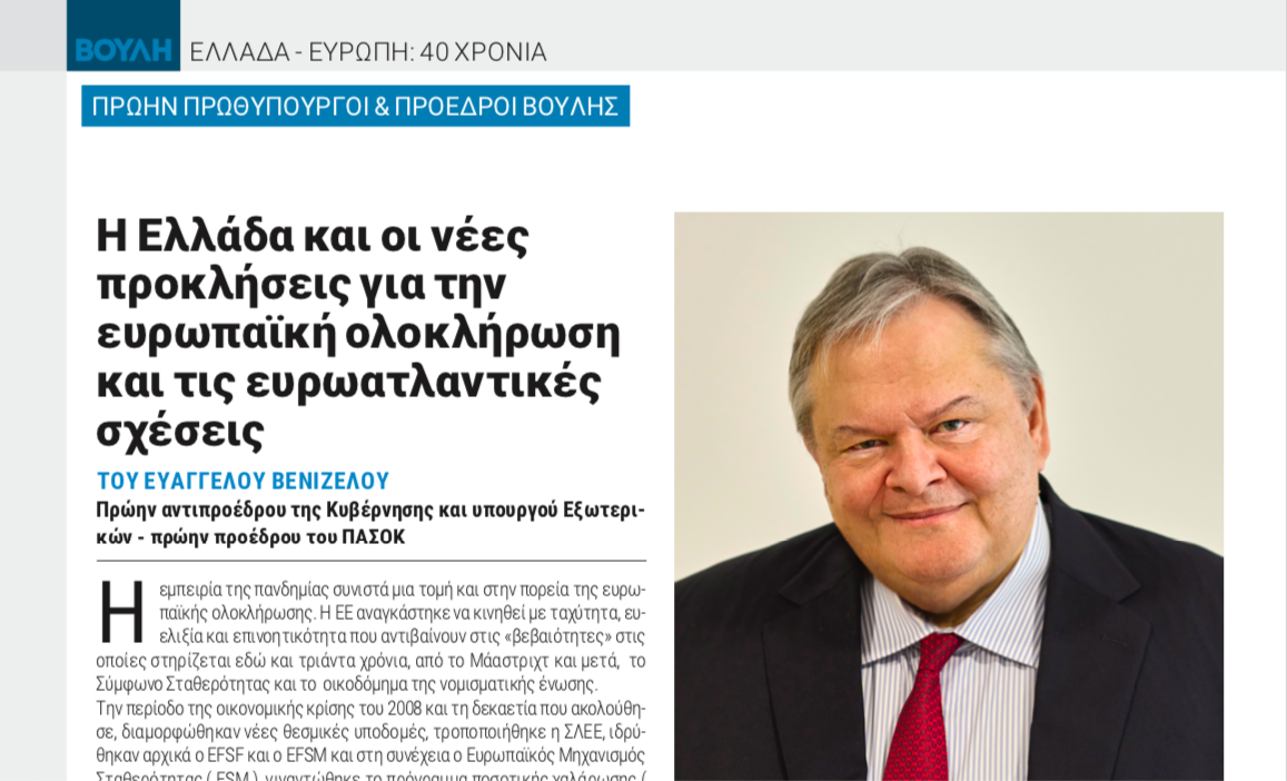 Ευ. Βενιζέλος: Η Ελλάδα και οι νέες προκλήσεις για την ευρωπαϊκή ολοκλήρωση και τις ευρωατλαντικές σχέσεις