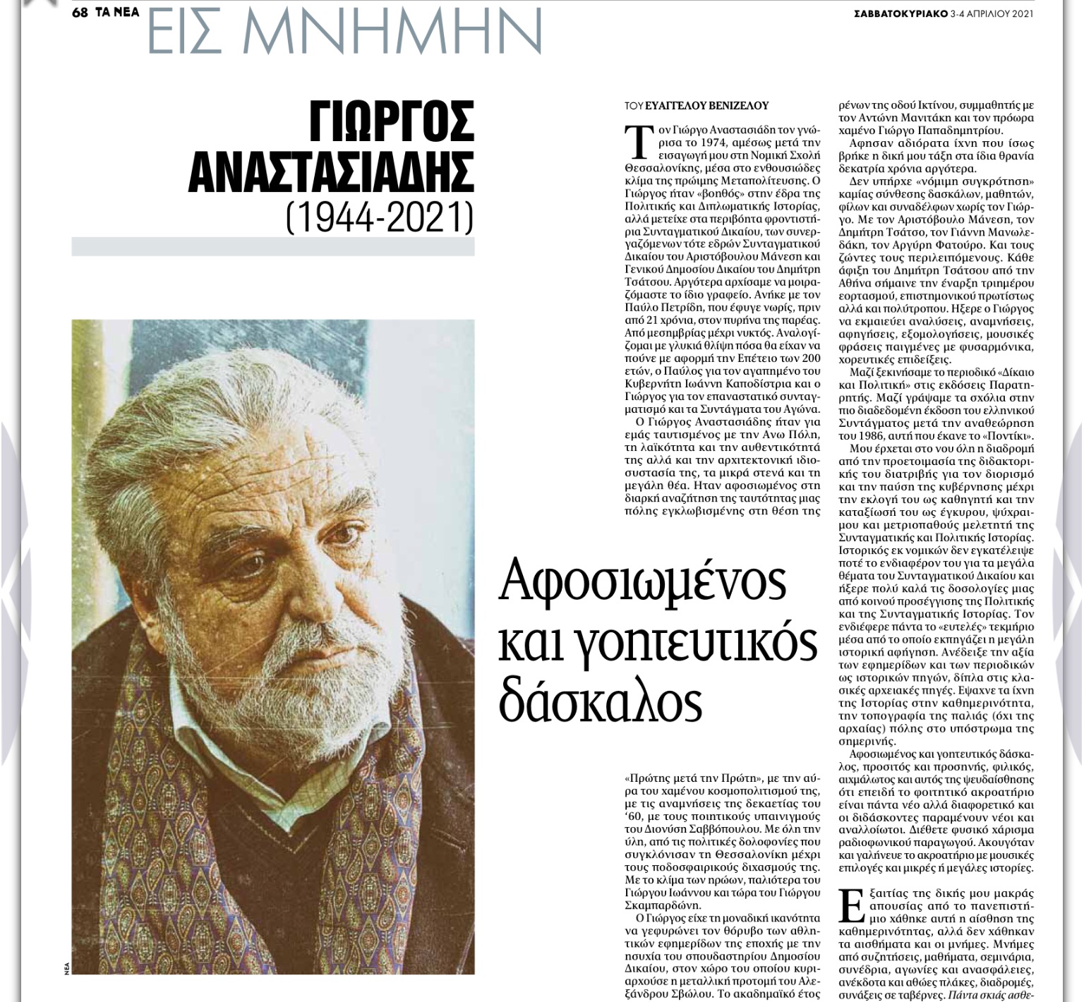 Τον Γιώργο Αναστασιάδη τον γνώρισα το 1974, αμέσως μετά την εισαγωγή μου στη Νομική Σχολή Θεσσαλονίκης, μέσα στο ενθουσιώδες κλίμα της πρώιμης Μεταπολίτευσης. Ο Γιώργος ήταν «βοηθός» στην έδρα της Πολιτικής και Διπλωματικής Ιστορίας, αλλά μετείχε στα περιβόητα φροντιστήρια Συνταγματικού Δικαίου, των συνεργαζόμενων τότε εδρών Συνταγματικού Δικαίου του Αριστόβουλου Μάνεση και Γενικού Δημοσίου Δικαίου του Δημήτρη Τσάτσου. Αργότερα αρχίσαμε να μοιραζόμαστε το ίδιο γραφείο. Ανήκε με τον Παύλο Πετρίδη, που έφυγε νωρίς, πριν 21 χρόνια, στον πυρήνα της παρέας. Από μεσημβρίας μέχρι νυκτός. Αναλογίζομαι με γλυκιά θλίψη πόσα θα είχαν να πούνε με αφορμή την Επέτειο των 200 ετών, ο Παύλος για τον αγαπημένο του Κυβερνήτη Ιωάννη Καποδίστρια και ο Γιώργος για τον επαναστατικό συνταγματισμό και τα Συντάγματα του Αγώνα.