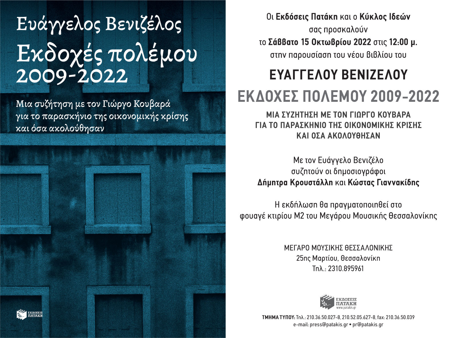 Οι εκδόσεις Πατάκη και ο Κύκλος Ιδεών σας προσκαλούν το Σάββατο 15 Οκτωβρίου 2022, ώρα 12:00 στην παρουσίαση στη Θεσσαλονίκη του νέου βιβλίου του Ευάγγελου Βενιζέλου, «Εκδοχές πολέμου 2009-2022. Μια συζήτηση με τον Γιώργο Κουβαρά για το παρασκήνιο της οικονομικής κρίσης και όσα ακολούθησαν», εκδόσεις Πατάκη.
