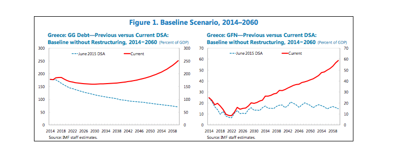 Το τραγικό είναι ότι η μελέτη του ΔΝΤ υπολογίζει την αρνητική επίπτωση στη δυναμική του χρέους της περιόδου από τον Ιούνιο 2015 έως σήμερα. Τον Ιούνιο του 2015, σύμφωνα με τη μελέτη, η προοπτική του χρέους ήταν να βρίσκεται το 2060 κάτω από το 70% του ΑΕΠ, οι δε χρηματοδοτικές ανάγκες να κινούνται κάτω από το παραδεκτό όριο του 15% του ΑΕΠ. Μετά τα όσα μεσολάβησαν επί ημερών ΣΥΡΙΖΑ – ΑΝΕΛ, σύμφωνα με τη μελέτη, η δυναμική του χρέους τείνει να ξεπερνά το 2060 το 250% του ΑΕΠ ενώ οι χρηματοδοτικές ανάγκες εκτινάσσονται στο 60 % του ΑΕΠ (Figure 1. Baseline Scenario, 2014-2060, σελίδα 6 της μελέτης του ΔΝΤ). Εάν γίνουν οι παραμετρικές αλλαγές που ζητά το ΔΝΤ, η δυναμική του χρέους επανέρχεται εκεί που βρισκόταν το 2015 (Figure 2. Debt Restructuring, 2014–2060, σελίδα 7 της μελέτης του ΔΝΤ).